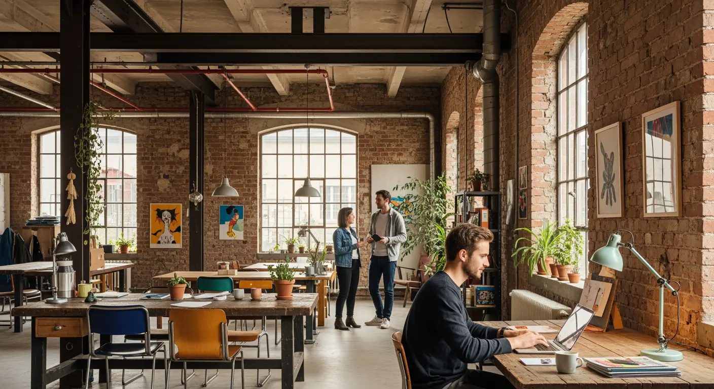 Alternative Arbeitsorte in Friedrichshain zeichnen sich vor allem durch ihre architektonische und gestalterische Unkonventionalität aus, die einen bewussten Bruch mit herkömmlichen Büroräumen markieren. Häufig prägen industrielle Elemente wie freiliegende Backsteinwände, offene Stahlträger und Sichtbeton das Raumgefühl, was eine rohe, unverfälschte Atmosphäre schafft. Dieses ästhetische Umfeld verzichtet bewusst auf glattpolierte Oberflächen und sterile Perfektion und setzt stattdessen auf Authentizität, sichtbar in der Erhaltung der ursprünglichen Bausubstanz und der bewussten Integration von Fundstücken aus der Industriegeschichte.